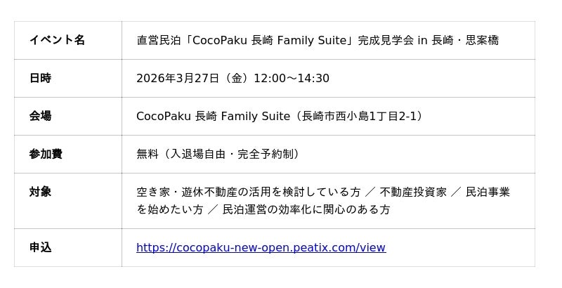 【直営物件2棟目】長崎エリア最大級の面積を誇る民泊「Coco Paku 長崎 Family Suite」を2026年2月にオープン
