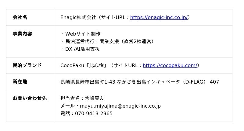 Enagic株式会社(本社:長崎県長崎市)が展開する地方特化の民泊ブランド「CocoPaku(此心宿)」は、2026年2月、長崎市西小島に直営民泊施設「CocoPaku 長崎 Family Suite」をオープンいたしました。(旅館業にて営業)