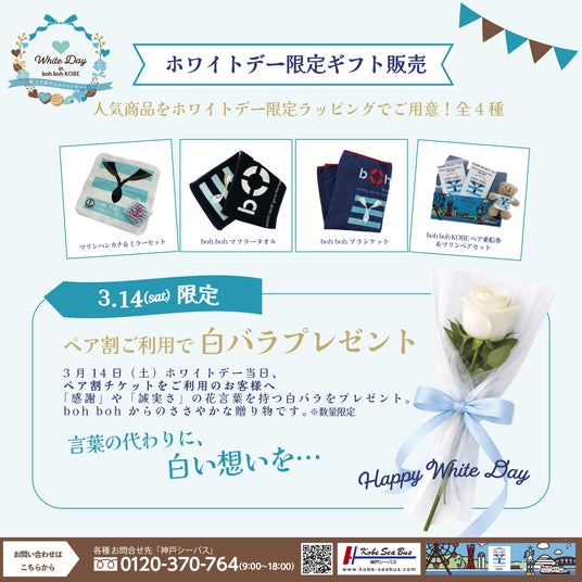 神戸港を周遊するクルーズ船「神戸シーバス boh boh KOBE」は、2026年3月1日(日)~3月15日(日)の期間限定で、ホワイトデー特別企画『White Day in boh boh KOBE ~船上で旅するホワイトデート~』を開催いたします。