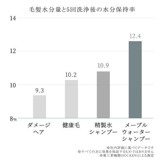 OLES研究チームの比較試験により、メープルウォーター配合シャンプーは精製水シャンプーを上回る水分保持率を記録しました。健康毛・ダメージ毛を5回洗浄した評価では、10.9%に対し12.4%という差を確認。