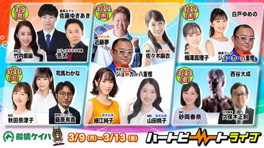 本開催は「大井×船橋スプリングドリームリレー」と題し、大井(昼)と船橋(夜)を跨ぐ1日最大24レースの特別リレー開催を実施します。船橋競馬では3月11日(水)の「ダイオライト記念(JpnII)」、12日(木)の「ネクストスター東日本(SIII)」と、注目の重賞が連日開催されます。