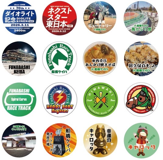 船橋ケイバオリジナルの缶バッジが手に入ります!種類は全部で16種類!