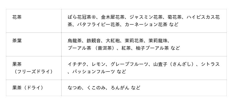 - 茶葉に関しては発酵度合いや産地、製造工程や製造方法によって味が違うこと、花茶や果茶もそれぞれの産地、味や香りの特徴、相性の良い茶葉についてなど、スタッフからご説明いたします。