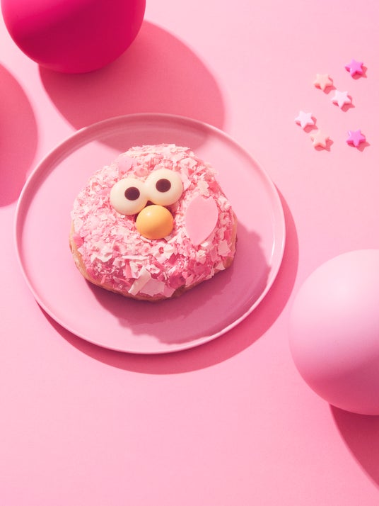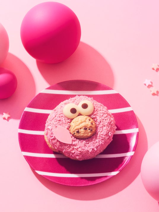 クッキーモンスターのPINKドーナツは、ふわふわのドーナツ生地にみたらしソースを染み込ませ、ピンクに色付けしたホワイトチョコレートでコーティングし、仕上げにはサクサク食感が楽しめるピンク色のフレークをトッピングしました。