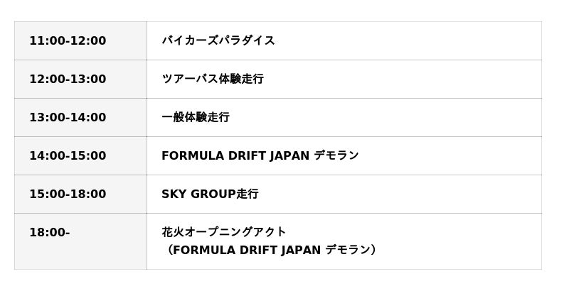 バイク愛好家による走行からスタートし、ツアーバスや一般参加型の体験走行など、来場者が実際にサーキットを体感できる機会をご用意。さらに、「FORMULA DRIFT JAPAN」による迫力のデモランや、ハイパフォーマンスカーによる走行プログラムなど、スピードウェイならではのダイナミックな体験型コンテンツが続きます。