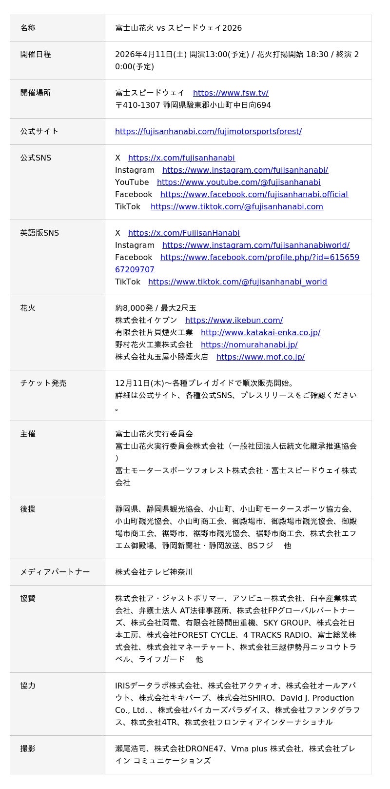■「富士山花火 vs スピードウェイ2026」開催概要