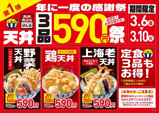サトフードサービス株式会社(本社・大阪府大阪市、代表取締役執行役員社長・杉本 貴之)が運営する「天丼・天ぷら本舗 さん天」では、2026年3月6日(金)から、日頃のご愛顧に感謝を込めて「年に一度の感謝祭」を開催します。第1弾は2026年3月6日(金)~2026年3月10日(火)まで「天丼3品590円祭」を開催します。対象天丼が最大200円引きになるお得なキャンペーンです。第2弾は2026年3月11日(水)~2026年3月22日(日)まで「トッピング祭」を開催します。天丼・定食・弁当を購入でおすすめトッピング3個1セットがお得に購入できます。ボリューム満点のトッピングセットは全3種類ご用意しておりますので、お好みのトッピングをお楽しみいただけます。