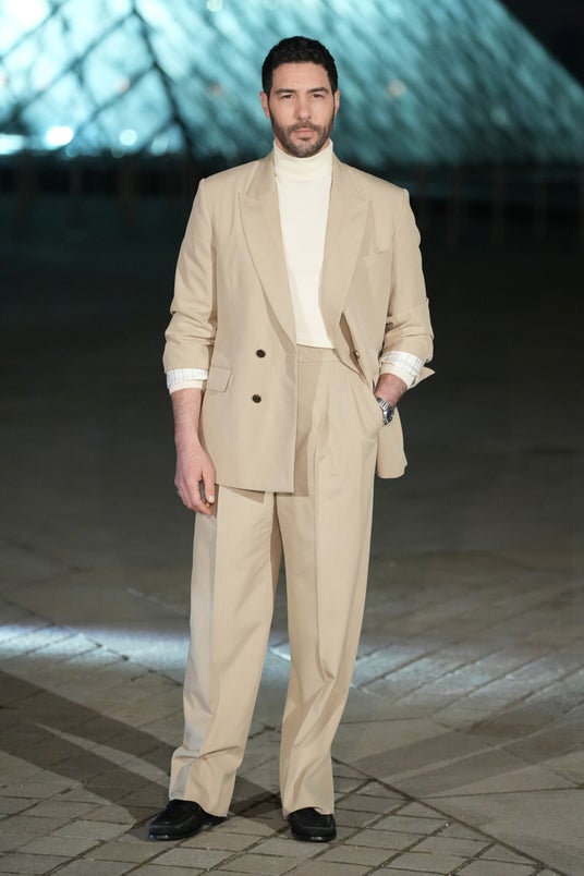 タハール・ラヒムは、ベージュのダブルブレストスーツにホワイトのタートルネックニット、ブラックの「メジャー ローファー」をコーディネートしました。