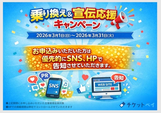 チケット販売サービス「チケットペイ」は、2026年3月1日(日)から3月31日(火)までの期間限定で、イベント主催者を対象とした「乗り換え&宣伝応援キャンペーン」を実施いたします。