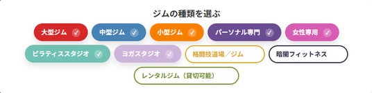 デフォルトで「大型ジム」「中型ジム」「パーソナル専門」「女性専門」「ピラティススタジオ」「ヨガスタジオ」にチェックが入っており、ここから自由にカスタムできます。