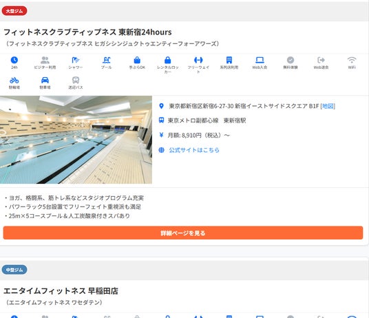 例えば、「新宿区 × 大型ジム or 中型ジム or 小型ジム × 24h and シャワー」で検索すると、このような検索結果が表示されます。