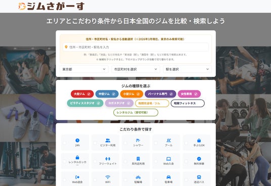 “ジム探しの非効率”を解消。エリア×条件で検索できるフィットネス施設検索サイト「ジムさがーす」公開