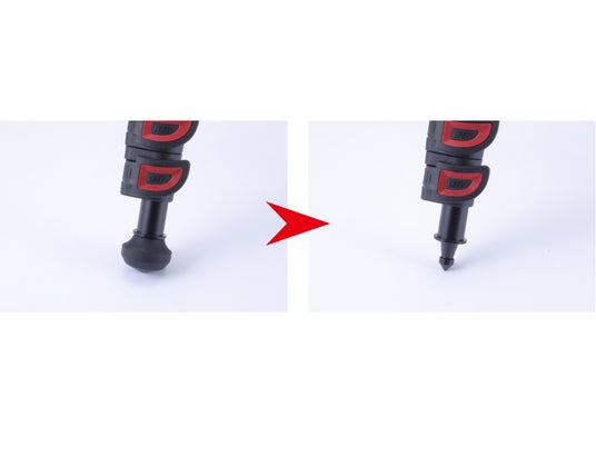 石突ゴムを外すと金属製のスパイクへ切り替え可能。硬い地面にしっかりと設置できます。