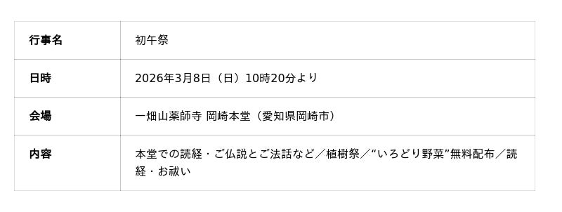 一畑山薬師寺(愛知県岡崎市)は、2026年3月8日(日)10時20分より岡崎本堂にて「初午祭」を厳修いたします。本祭では、諸神霊の外神様を敬い、諸願成就を祈念。夢や願いを書いた奉納用紙(バイオサイクル紙)とともに植樹を行う“植樹祭”も同日に開催いたします。