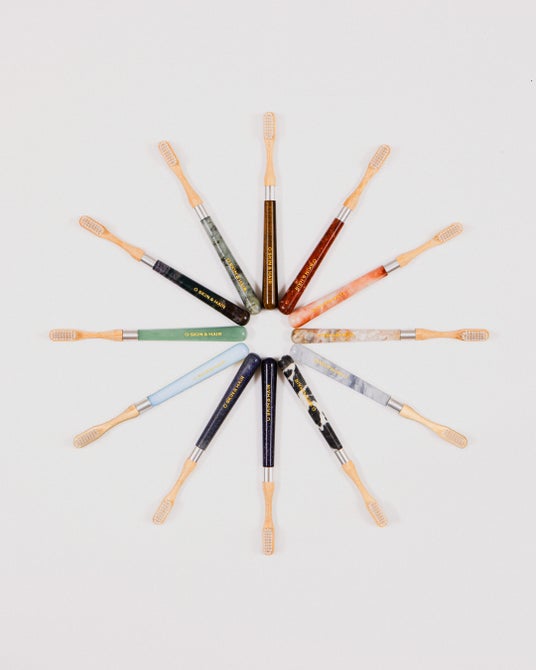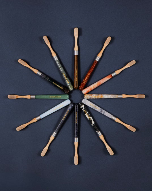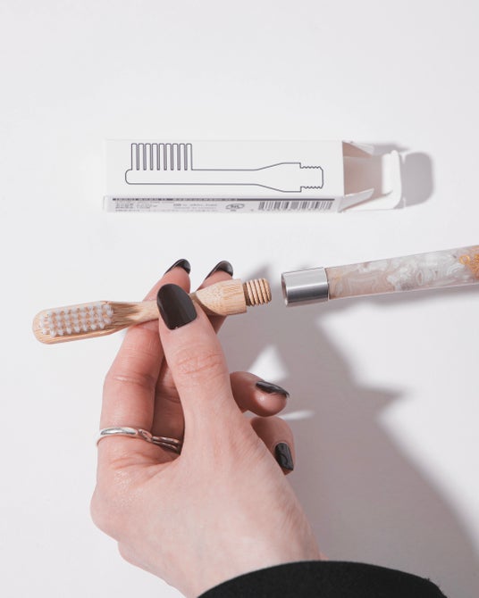長い時間をかけて自然が生み出した色や模様は、ひとつとして同じものがなく、それぞれが異なる存在感を放ちます。機能性・美意識・サステナブルな思想を兼ね備えた設計。繰り返し使えるハンドルに、しなやかで耐久性に優れたバンブー素材の交換式ヘッドを採用。ブラシ毛は先端を細く整え、歯間や歯周部まで届きやすい仕様です。