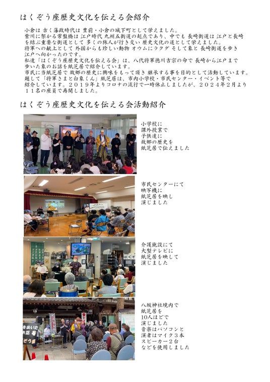 白象が江戸時代に長崎街道を歩いた歴史を、子どもにも分かりやすいく紙芝居で紹介します。