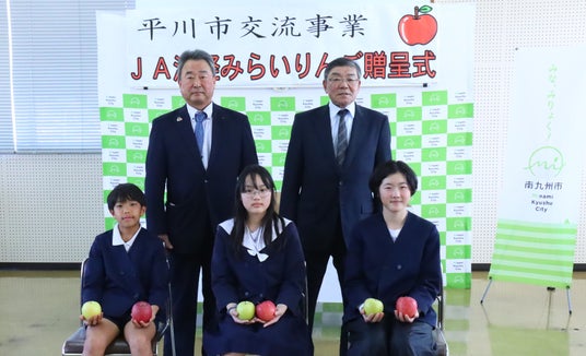 青森県からJA津軽みらいの代表理事組合長を含む4名が来庁され,青森県産のりんごを贈呈いただき、当市からは小・中学校を代表して知覧小学校6年生の3名が参加しました。