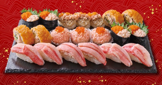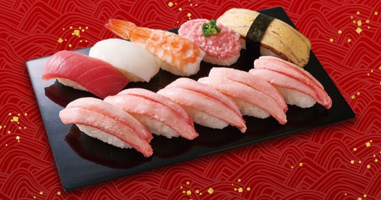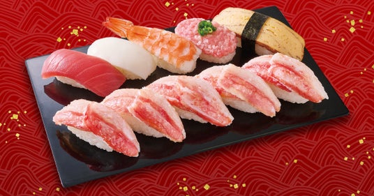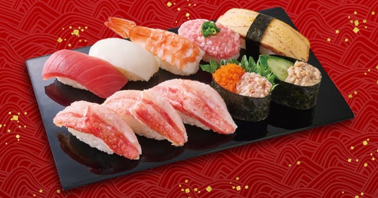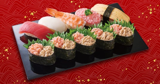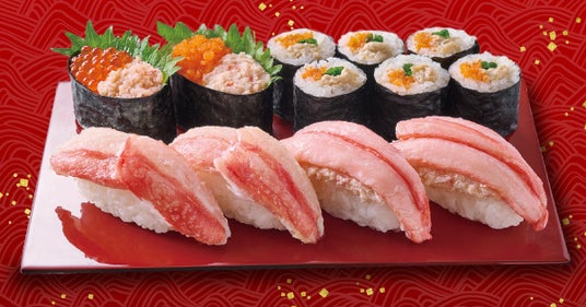 フェア限定【かにネタ】とともに、まぐろやえびなどの人気ネタを楽しめるバラエティ豊かな盛り合わせです。