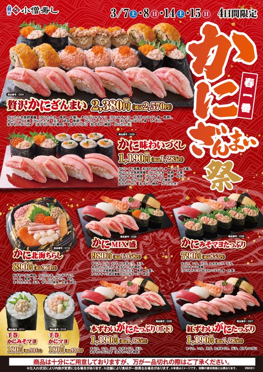 KOZOホールディングス株式会社の子会社である株式会社小僧寿しは、持ち帰りすし店「小僧寿し」にて、2025年3月7日(土)・8日(日)・14日(土)・15日(日)の期間限定で『春一番 かにざんまい祭』を開催します。