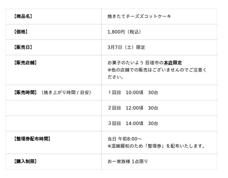 株式会社太陽社(所在地:千葉県匝瑳市飯倉293、代表取締役:片岡正裕)が展開する、千葉県で長年愛され続ける菓子店「お菓子のたいよう」は、2023年より人気爆発中の“焼きたてスイーツシリーズ”の新作として、「焼きたてチーズズコットケーキ」を2026年3月7日(土)1日限定で販売します。