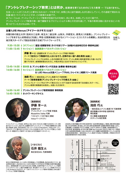 アントレプレナーシップをどうやって教えたらいいのか?「自走する生徒を育てる仕組み」をテーマに、アントレ教育の実践者をお招きし、基調講演とパネルディスカッションを行います。IJIE-Nexus 教育機関向け支援メニュー「TRAIL(トレイル)」概要リリース発表