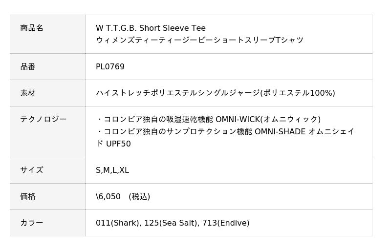 ”コロンビアとしてアウトドアを楽しむすべての女性へ、今後の活躍を共に目指していく”というコンセプトの元に開発された本コレクションは、汗を素早く吸収して乾かす独自の速乾機能オムニウィックと紫外線カット機能オムニシェイドが搭載されたTシャツ「W T.T.G.B. Short Sleeve Tee(ウィメンズティーティージービーショートスリーブTシャツ)」と「T.T.G.B Booney(ティーティージービーブーニー)」で構成されます。