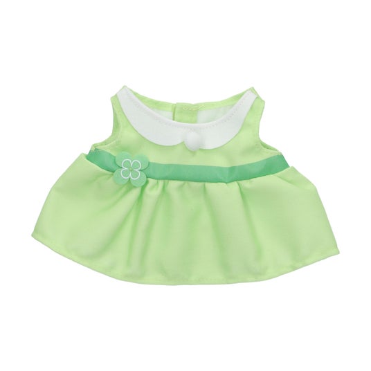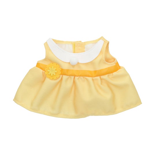 今回登場する着せかえお洋服は、春に黄色い花を咲かせる「タンポポ」と幸運の花言葉を持つ「クローバー」をモチーフにした、丸襟のシンプルなワンピースです。着脱しやすいノースリーブタイプで、ウエストマークには立体的なタンポポやフェルト素材のクローバーのモチーフをあしらいました。襟元のフロッキー素材の白いボタンは、タンポポの綿毛やシロツメクサをイメージしています。同日発売のマスコットは、おそろいのワンピースを着用しています。