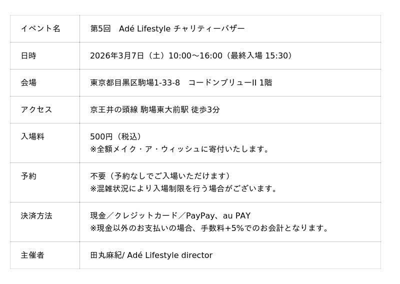 「毎日に、上質とやさしさを。」をコンセプトに、デザイン性と実用性を兼ね備えたアイテムを展開する「Ade Lifestyle」は、2026年3月7日(土)、第5回となるチャリティーバザーを東京・駒場にて開催いたします。本バザーは、ブランド発足時より継続している公益財団法人メイク・ア・ウィッシュ オブ ジャパン(以下、メイク・ア・ウィッシュ)への支援活動の一環として実施するものです。売上の一部に加え、入場料500円(税込)の全額をメイク・ア・ウィッシュに寄付いたします。