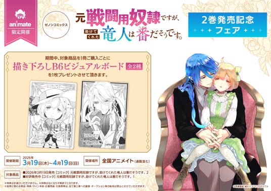 株式会社コアミックス(東京都武蔵野市)は、全国のアニメイトにて『元戦闘用奴隷ですが、助けてくれた竜人は番だそうです。』紙コミックス版 第2巻発売記念フェアを開催いたします。期間中、対象商品を1冊ご購入ごとに1枚「描き下ろしB6ビジュアルボード(全2種)」をプレゼントいたします。