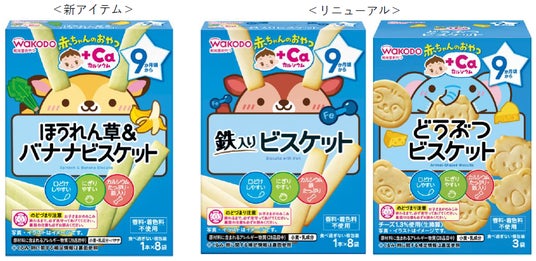 アサヒグループ食品株式会社(本社 東京、社長 川原浩)は、和光堂ブランドのベビー向けおやつ「赤ちゃんのおやつ+Caカルシウム」シリーズに「ほうれん草&バナナビスケット」を追加し、「鉄入りビスケット」「どうぶつビスケット」をリニューアルして3月9日から発売します。