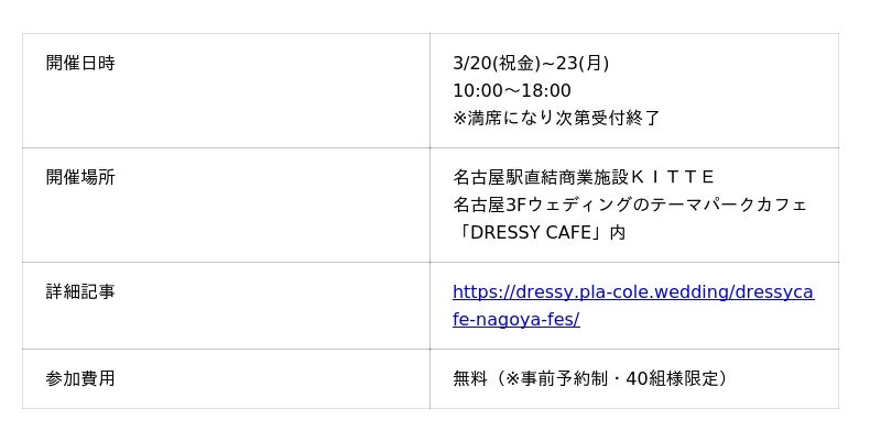 「PLACOLE & DRESSY」ブランドを展開する、冒険社プラコレ(本社:神奈川県鎌倉市、代表取締役CEO:武藤功樹)は、名古屋駅直結商業施設KITTE名古屋3F、ウェディングのテーマパークカフェ"DRESSY CAFE"にて、3/20(祝金)~23(月)の4日間限定で、これから結婚式をお考えのカップル様に向けた、個室相談やウェディングドレス試着ができる豪華特典付きのウェディング初体験フェスを開催いたします。(40組様限定、無料開催)