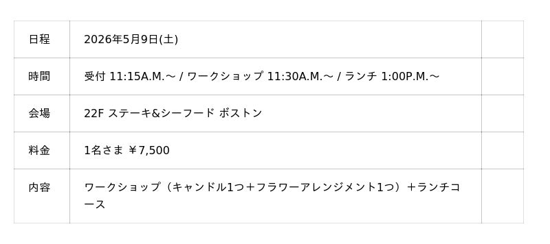 本イベントでは、22階のレストラン「ステーキ&シーフード ボストン」の瀬戸内海の多島美を一望する空間で、色鮮やかなドライフラワーやハーブを閉じ込めた「ミニボタニカルキャンドル」と、母の日のプレゼントにもおすすめの青いカーネーションを使用した「フラワーアレンジメント」を制作いただきます。当日は広島市中区でキャンドルショップを展開している「SEND Hiroshima」より講師を招きレクチャーいただきます。ワークショップの後には、花をテーマにした特別なランチコースをご用意。
