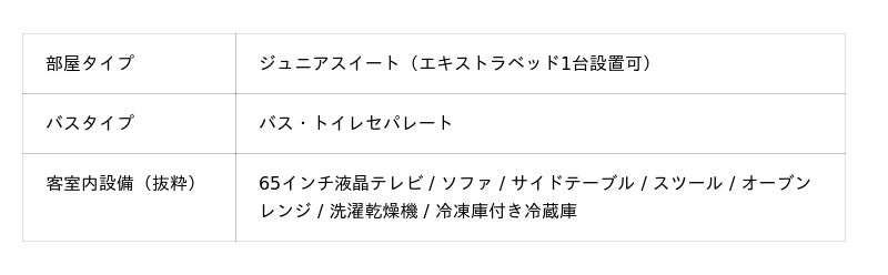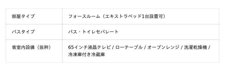 室内設備:全室40インチ以上の液晶テレビ(ミラーリング・動画配信サービス対応)、冷蔵庫、加湿空気清浄機、電気ケトル、マルチタイプ携帯充電器、セーフティボックス、消臭スプレー など(全室/無料)