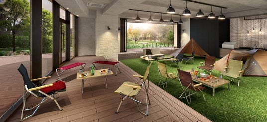 人気のギアを使用したキャンプサイトが出現。キャンプ用テーブルや焚火台をインテリアの一部とした活用法など、外で使うためにつくられたキャンプ道具を、屋内でも上手に使いこなすイメージにも。都心にいながらアウトドア気分を満喫できます。