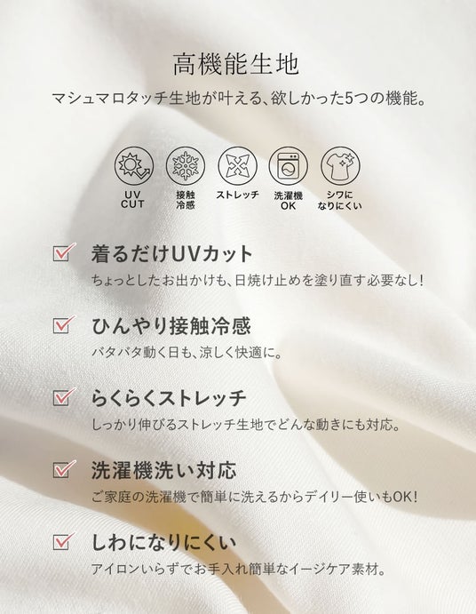 マシュマロタッチ生地が叶える、欲しかった3つの機能を叶えた生地。接触冷感・UVカット・洗濯機OK。