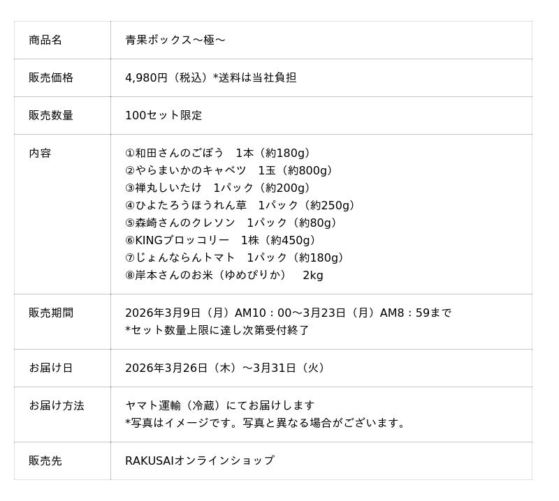 楽彩株式会社(本社:東京都足立区、代表取締役社長:大崎善保)は、トップクラスの生産者の野菜をラインナップした、RAKUSAI『青果ボックス~極~』の予約販売を3月9日(月)より開始いたします。一般市場には出回りにくい希少品種や、特定の土壌でしか育たない特化野菜など、「極」の名にふさわしい逸品を厳選。外食を超える贅沢を自宅で味わいたいという本物志向の方へ向けた、限定のプレミアムパッケージです。