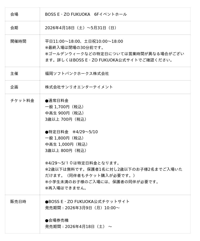 2026年4月18日(土)からBOSS E・ZO FUKUOKA 6Fイベントホールにて「SANRIO CHARACTERS KAWAII TOWN」を開催いたします。韓国や東京、サンリオテーマパークなど、各地で人気を集めた展示やコンテンツを厳選!九州初登場のコンテンツが盛りだくさんです!ピューロランド限定グッズも登場!期間中はワークショップやキャラクターグリーティングも開催いたします。