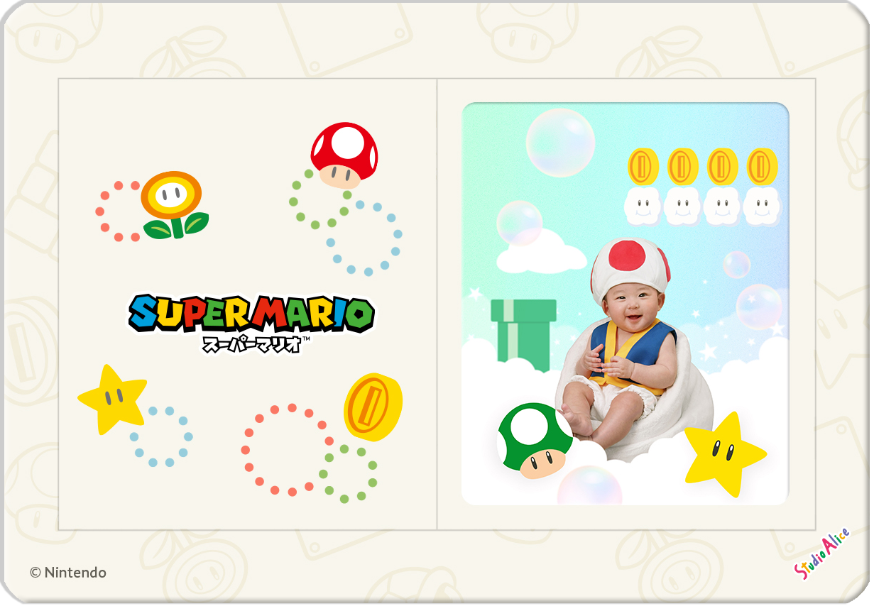 スーパーマリオ撮影は、スーパーマリオの世界をモチーフにした背景で撮影することができるスタジオアリスの人気のメニューです。今回導入する背景は、マイマリオのデザインで、雲の上にいるようなふわふわとした空間と、空の色をイメージしたパステルカラーが淡く溶け合うようなグラデーショ ンで全体をやさしく包み込むトーンに仕上げた、赤ちゃんの柔らかさや可愛らしさをより一層際立たせるデザインです。「ベビィマリオ」「ベビィルイージ」「キノピオ」のキャラクターになりきって、まるでスーパーマリオのゲームの世界に入り込んだような撮影をお楽しみください。