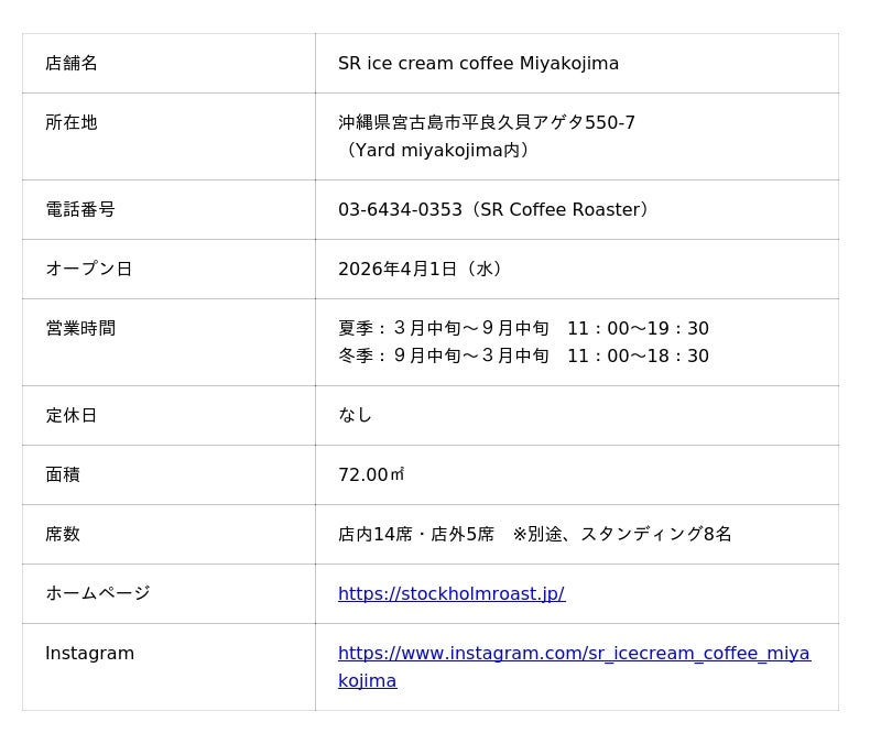株式会社リエイグループの子会社であるストックホルムロースト株式会社(本社:千葉県浦安市、代表取締役:椛澤優奈)は、2026年4月1日(水)、沖縄県宮古島市に新店舗『SR ice cream coffee Miyakojima』をオープンいたします。本店舗は、三菱地所株式会社および鹿島建設株式会社が共同で開発した新施設「Yard miyakojima」内に出店するものです。