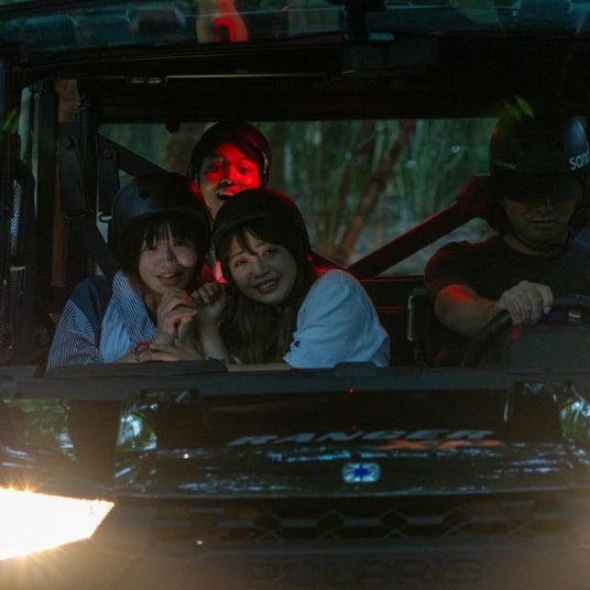 暗闇に包まれた森を進むライド&ウォーク型のナイトバギーアトラクションを体験します。暗闇が苦手なお子様は、スクールツアーシップ主催のお楽しみ会へ参加します。