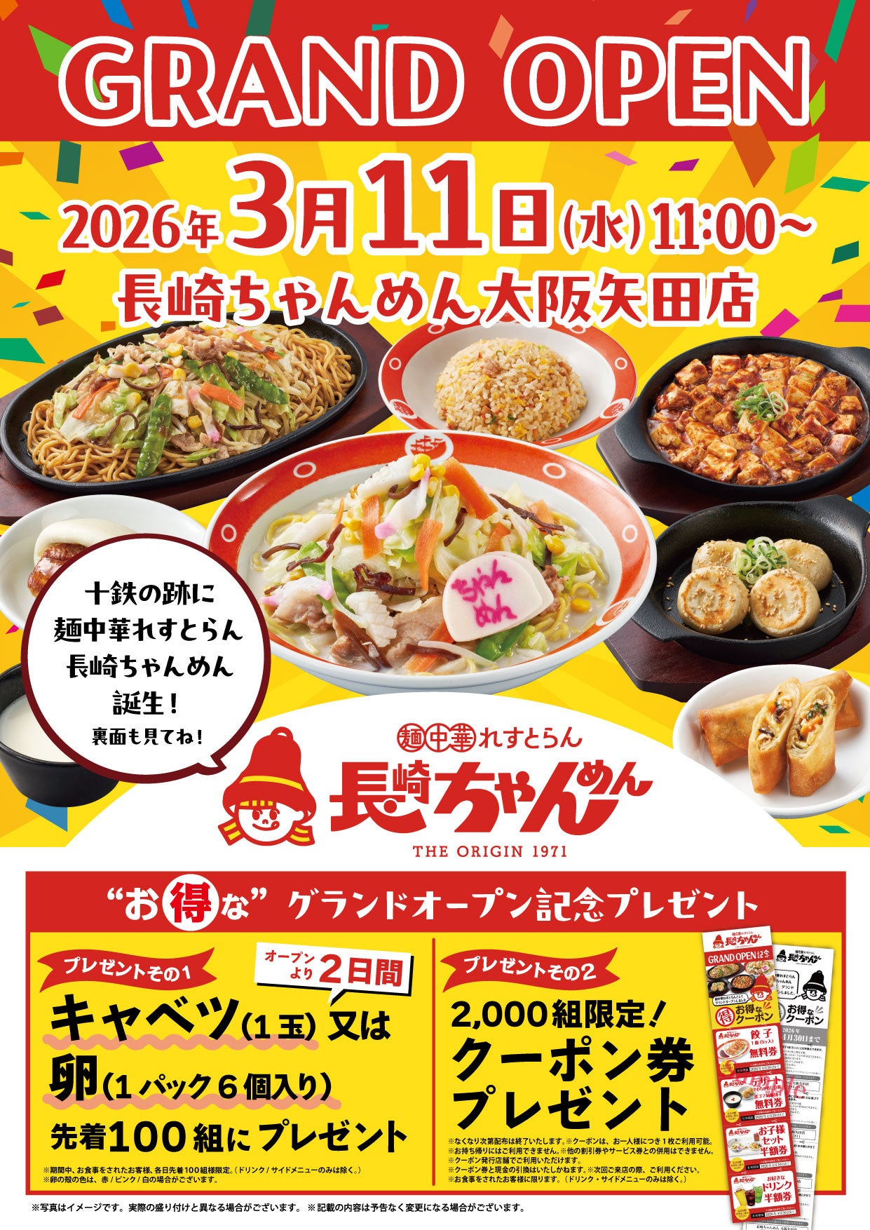 長崎ちゃんぽん十鉄跡地に「長崎ちゃんめん」大阪矢田店を「麺中華れすとらん」としてのブランドも新たに3月11日(水)にグランドオープンいたします。「鉄板焼きちゃんめん」シリーズや「中華かつ丼」など、麺、中華としての可能性を追究した新メニューもご用意いたします。また、3月11日(水)・12日(木)の両日は先着100組様にキャベツ(1玉)または卵(1パック:6個入り)をプレゼントいたします。さらに、2,000組様限定でお得なクーポン券もご用意しております。是非、この機会にお得に「長崎ちゃんめん」をお楽しみください。スタッフ一同、皆さまのご来店をお待ちしております。
