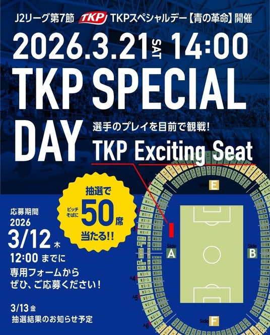 株式会社ティーケーピー(本社:東京都新宿区、代表取締役社長:河野 貴輝、以下TKP)は、株式会社大分フットボールクラブ(本社:大分県大分市、代表取締役:小澤 正風、以下大分FC)とスポンサー契約を締結しており、このたび、2026年3月21日(土)にクラサスドーム大分にて行われる明治安田J2・J3百年構想リーグ 地域リーグラウンド 第7節 FC琉球戦において、「TKPスペシャルデー【青の革命】」を開催することが決定しました。