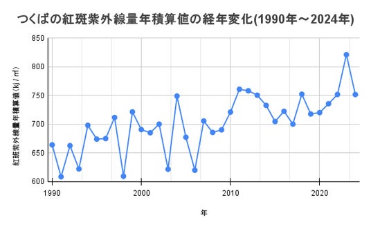 また、気象庁の解析によると、つくばにおける紅斑紫外線量(年積算値)は1990年の観測開始以降、年々増加傾向にあります。1990年には664.3kJ/平方メートル だった年積算紅斑紫外線量は、2024年には751.9kJ/平方メートル となり、約13%増加していることで今後も増加していく傾向にあることが予想されます。