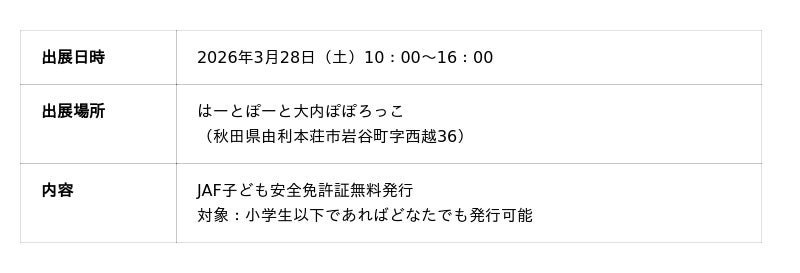 JAF(一般社団法人日本自動車連盟)秋田支部(支部長 伊藤哲充)は、2026年3月28日(土)にぽぽろっこ(秋田県由利本荘市)で開催される「春休み はたらく車大集合」に子どもの交通安全を訴求する「JAF子ども安全免許証」の無料発行と会員限定アプリクーポン優待を実施します。