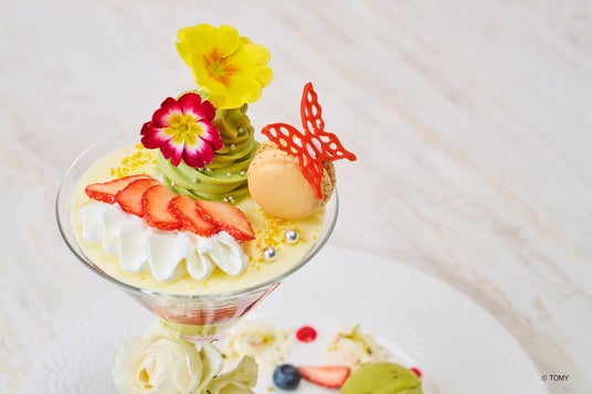 コラボレーション限定の、いちごとフラワーをテーマにしたパフェが登場!プレートアートまで華やかに彩られた目にも美しい鮮やかなパフェをご堪能ください。