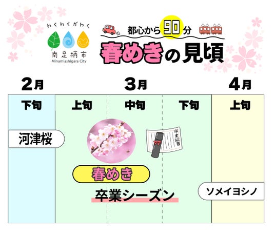 卒業生を祝福する 早咲きの桜「春めき」南足柄市内で品種登録された桜「春めき」は一般的なソメイヨシノよりも開花が早く、関東では3月中旬の卒業式シーズンに咲く早咲きの桜として人気があります。