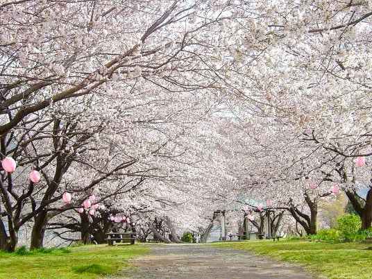 怒田丘陵の斜面に植栽された春めきが3月中旬に見頃になります。斜面下には遊歩道があり、迫力満点の春めきを楽しむことができます。