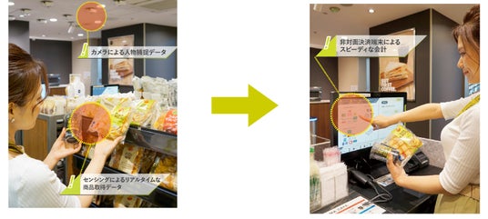 棚から商品を手に取っていただくと、レジでは商品スキャンをすることなく、ディスプレイの表示内容を確認してお会計いただくことにより、スピーディーにお買い物が完了します。