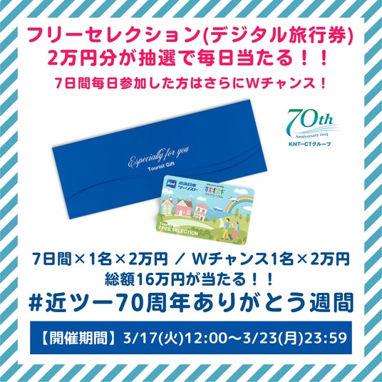 - 名称:KNT公式Xキャンペーン「#近ツー70周年ありがとう週間」- 実施期間:2026年3月17日(火)12:00~3月23日(月)23:59