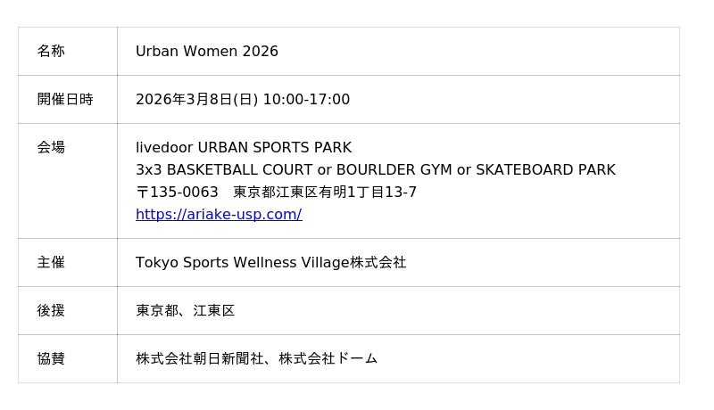TSP太陽株式会社(本社:東京都目黒区、代表取締役社長:池澤 嘉悟)は、企画・運営・会場設営を手掛けた体験型イベント「Urban Women 2026」を、国際女性デーである2026年3月8日(日)に「livedoor URBAN SPORTS PARK」にて初開催しました。本イベントは、日本を代表する女性トップアスリートである野口啓代氏(スポーツクライミング)、桂葵氏(バスケットボール)、四十住さくら氏(スケートボード)の3名がプロデューサーに就任。当日は多数の来場者が会場を訪れ、子どもから大人まで、約360人が競技体験会に参加しました。